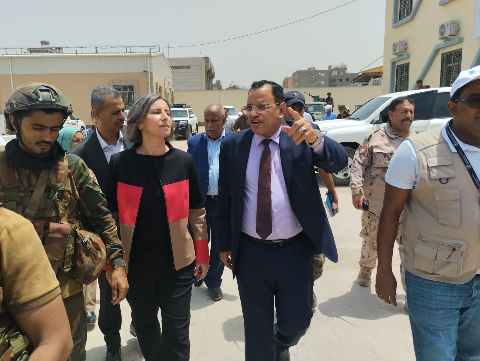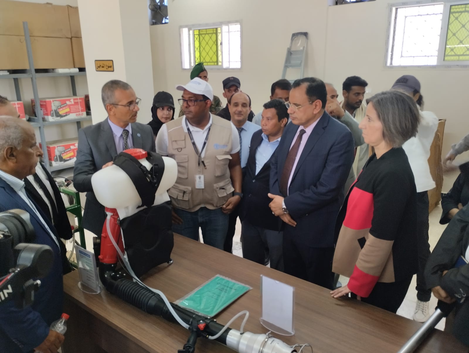 والممثل المقيم لمنظمة( FAO) الدكتور حسين جادين والدكتورة دينا ابوغيداء المدير القطري للبنك الدولي في اليمن بأقسام المركز متعرفاً على مكونات المركز وعدد من المكاتب الإدارية ،بالإضافة الى ادوات مكافحة الجراد الصحراوي والاجهزة والمعدات المحصصة لهذا العمل ونشاط المركز والأعمال الإنشائية التي تمت والتي شملت إنشاء اربعة مباناً للإدارة والتدريب والمخازن والورشة الفنية وتنفيذ اعمال تاثيث للمكاتب والقاعات وتوفير شبكة للطاقة الشمسية وتكييف وغيرها .