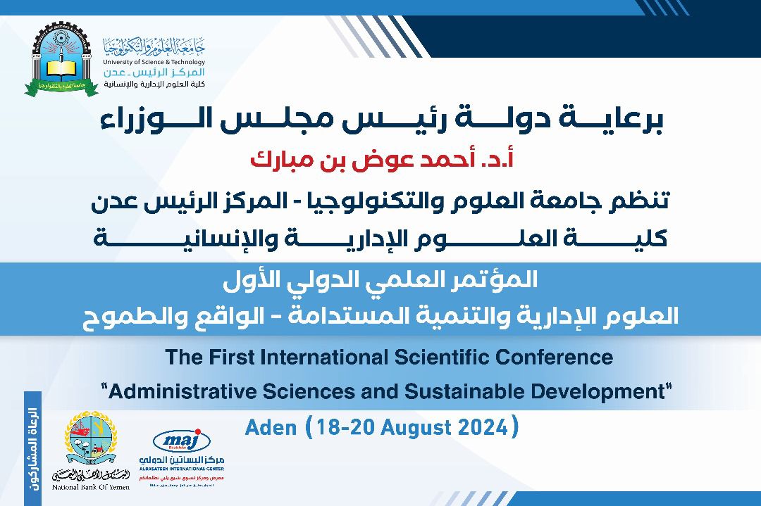 تعلن جامعة العلوم والتكنولوجيا – المركز الرئيس عدن عن قرب انعقاد مؤتمرها “المؤتمر العلمي الدولي الأول: العلوم الإدارية والتنمية المستدامة – الواقع والطموح”، والذي ستنظمه كلية العلوم الإدارية والإنسانية في الجامعة خلال الفترة من الأحد 18 إلى الثلاثاء 20 أغسطس 2024م في عدن، وذلك برعاية كريمة من دولة رئيس مجلس الوزراء أ.د. أحمد عوض بن مبارك -رئيس مجلس الوزراء.
