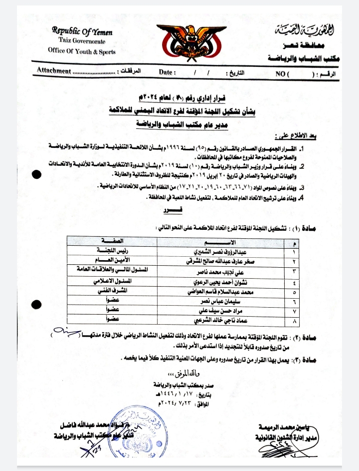 تشكيل لجنة مؤقتة لاتحاد الملاكمة فرع تعز من الأخوة التالية اسمائهم: