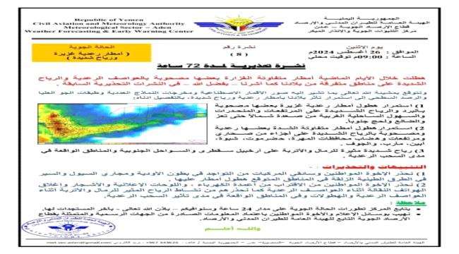 1) استمرار هطول أمطار رعدية غزيرة، بعضها مصحوبة بالبرد والرياح الشديدة على المرتفعات والمنحدرات والسهول الساحلية الغربية، من صعدة شمالاً حتى تعز والضالع ولحج جنوباً.