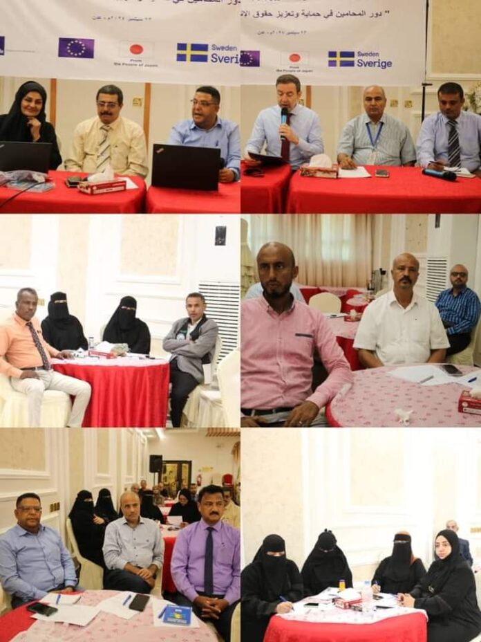 عقد صباح اليوم في العاصمة عدن مكتب مفوضية الامم المتحدة السامية لحقوق الانسان في اليمن بالشراكة والتعاون مع نقابة المحامين اليمنيين عدن لقاء تشاوري بعنوان دور المحامين في حماية وتعزيز حقوق الانسان في اليمن وقد حضر اللقاء عدد 31 مشارك و مشاركة، وقد ادار جلسات نقاش اللقاء التشاوري نقيب المحامين الاستاذ حميد البناء رئيس نقابة المحامين، وقد قدمت فيه 3اوراق عمل.