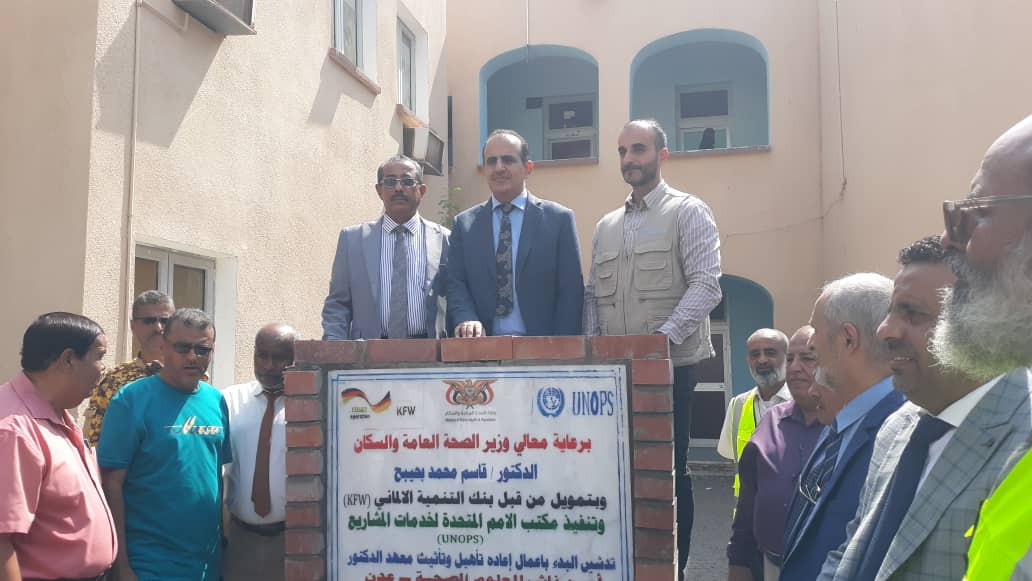 صباح اليوم ،حجر الأساس لمشروع البدء باعمال اعادة تاهيل وثاثيث معهد الدكتور امين ناشر للعلوم الصحية بعدن والذي ينفذها مكتب الأمم المتحدة لخدمات المشاريع (UNOPS) بتمويل من قبل بنك التنمية الألمانية(KFW)