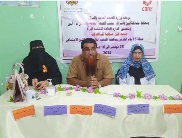 بحضور مدير عام مكتب الصحة العامة والسكان بمحافظة أبين الدكتور صالح قاسم الثرم اختتمت صباح اليوم إدارة تنمية المرأة بمكتب الصحة العامة والسكان م / أبين فعاليات حملة الـ 16 يوم لمناهضة العنف القائم على النوع الاجتماعي بمركز الأمومة والطفولة بمديرية زنجبار والتي أقيمت برعاية وزير الصحة العامة والسكان أ. د قاسم بحيبح ومحافظ محافظة أبين اللواء الركن أبو بكر حسين سالم وبإشراف مكتب الصحة العامة والسكان بمحافظة أبين وبالتنسيق مع الإدارة العامة لتنمية المرأة وبدعم من منظمة كير العالمية وتحت شعار “تمكين المرأة وقاية وصحة للجميع”.